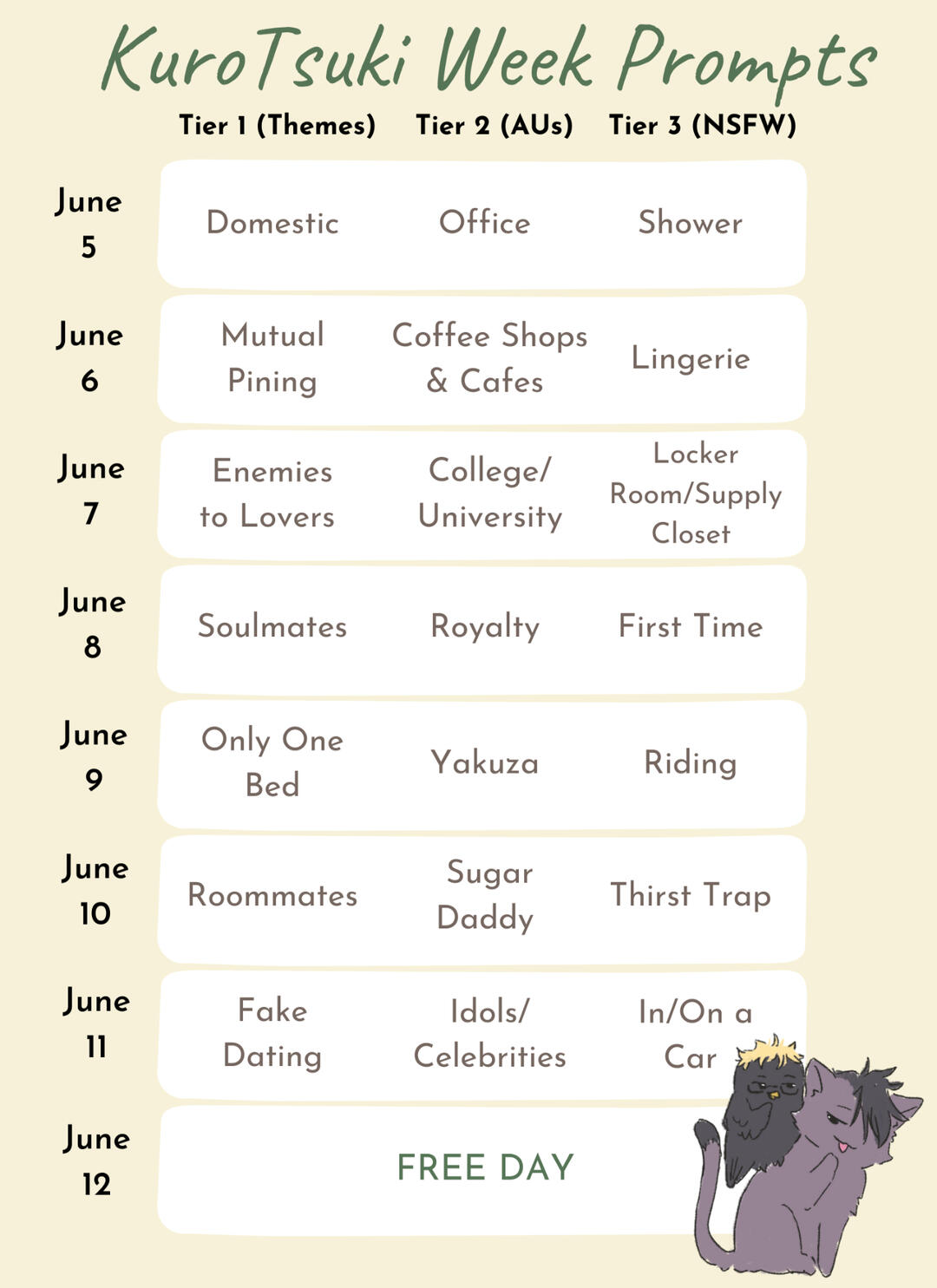 | Date | Tier 1: Themes | Tier 2: AUs | Tier 3: NSFW |